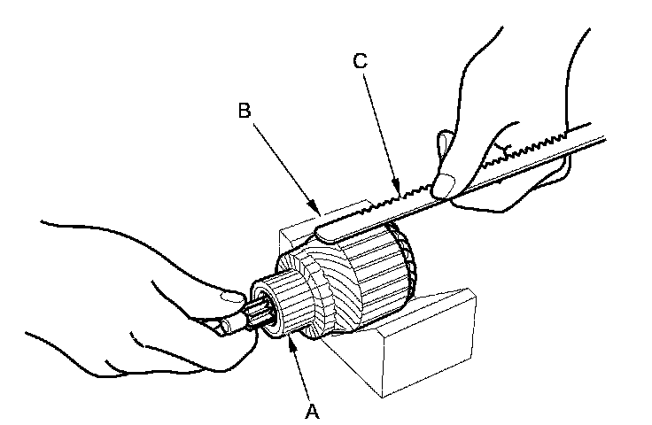 8. Place the armature (A) on an armature tester (B). Hold a hacksaw blade (C) on the armature core. If the blade is attracted to the core while the core is turned, the armature is shorted. Replace the armature.