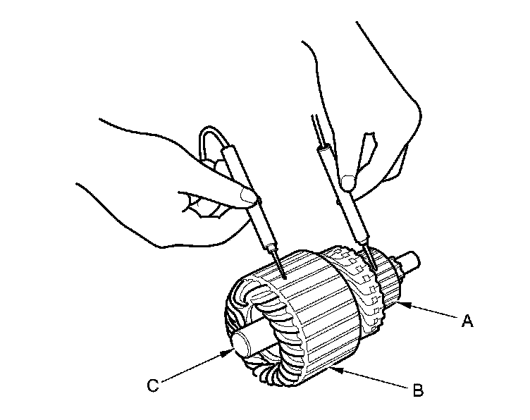 9. Use an ohmmeter to check for continuity between the commutator (A) and the armature coil core (B), and between the commutator and the armature shaft (C). If there is continuity, replace the armature.