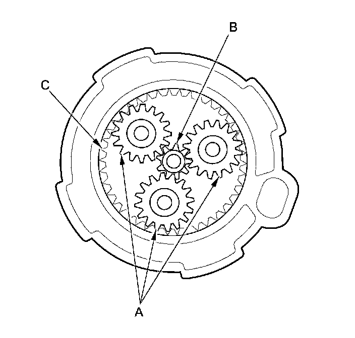 12. Check the planetary gears (A), the armature shaft gear (B), and the internal ring gear (C). Replace them if they are worn or damaged.