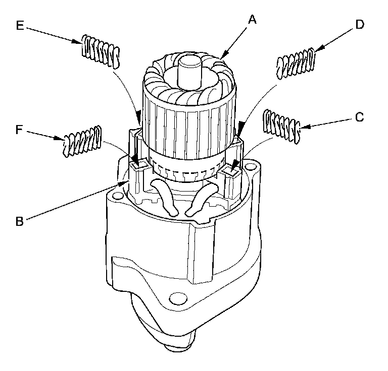 17. While squeezing a spring (C), insert it in the hole on the brush holder, and push it until it bottoms. Repeat this for the other three springs (D, E, and F).