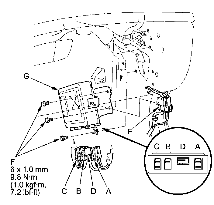 4. Remove the bolts (F) from the EPS control unit (G).