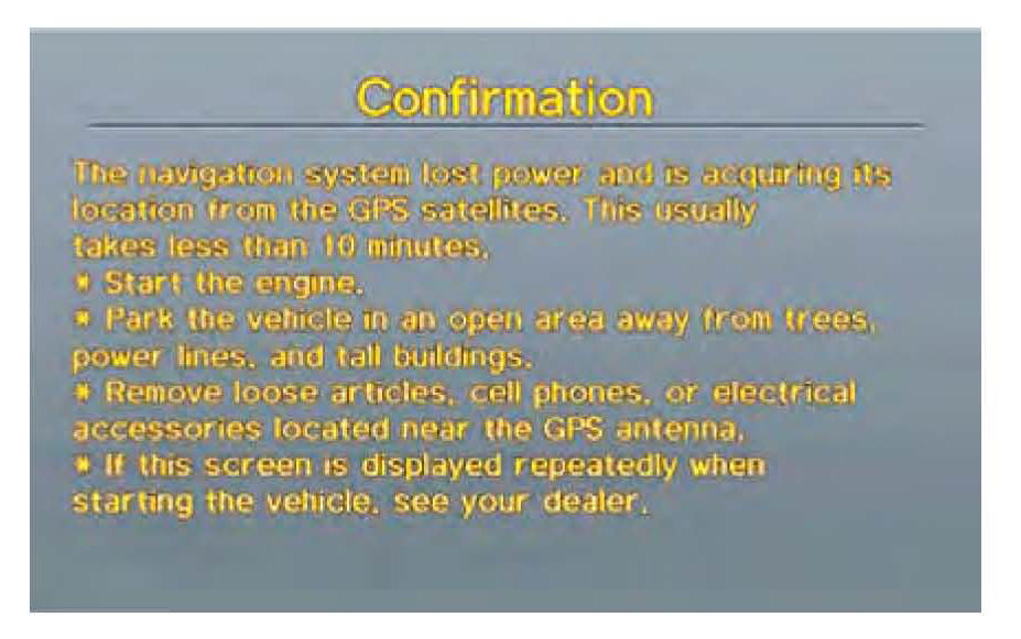 5. If the system does not initialize within 10 minutes, a second screen (shown) appears. The system is still initializing but will not automatically exit to the globe screen when the initialization is complete. Do not immediately follow the instructions on the screen. After 30 minutes, try restarting the engine to see if the navigation system completed the initialization. If it did not, follow the instructions on the screen.