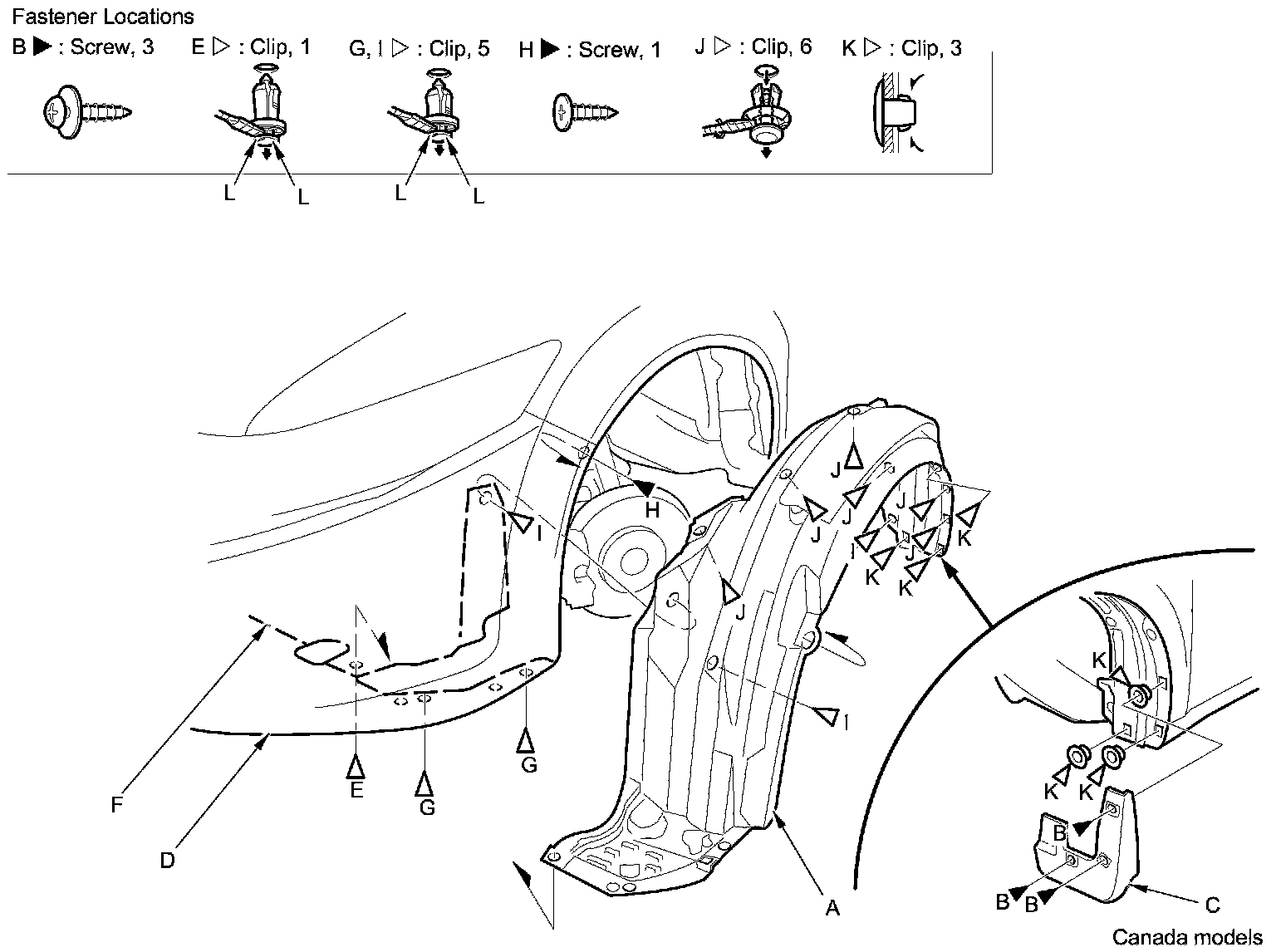 4. From the wheel arch, detach the clips (I, J, K) securing the front inner fender (and splash shield) to the body.