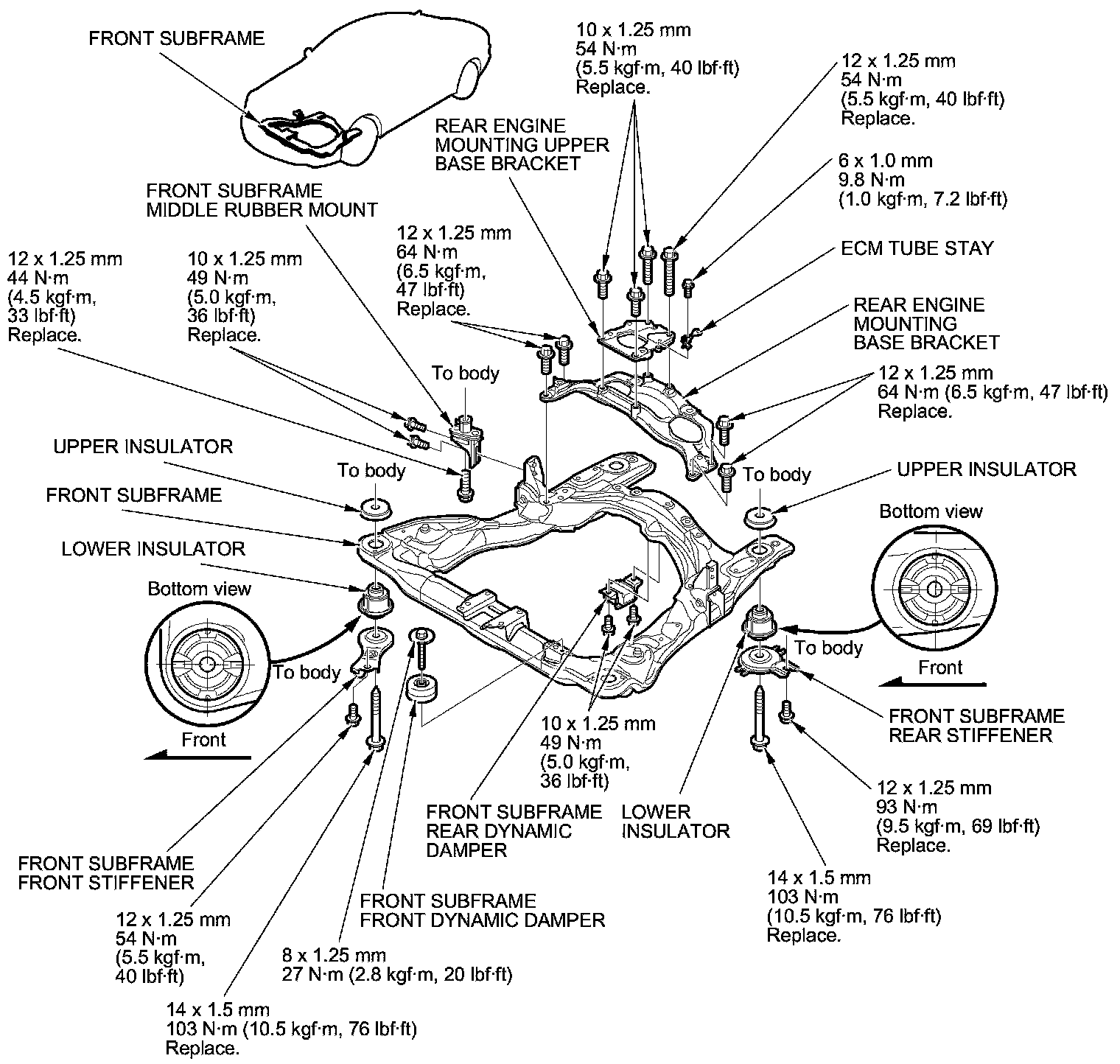 After removing the subframe mounting bolts, the front subframe middle rubber mount mounting bolts, the front subframe rear stiffener mounting bolts, the rear engine mounting base bracket mounting bolts, and the rear engine mounting upper base bracket mounting bolts, be sure to replace them with new ones.