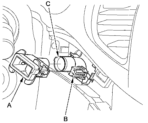 3. Pull out the in-car temperature sensor (A), disconnect the connector (B), and remove the in-car temperature sensor from the air hose (C).
