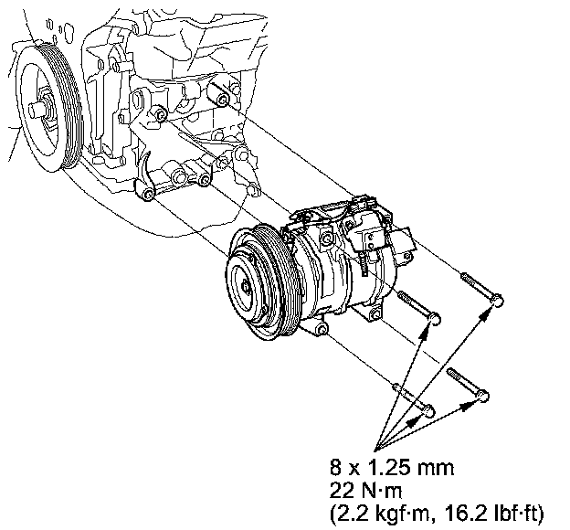 6. Install the A/C compressor in the reverse order of removal, and note these items: