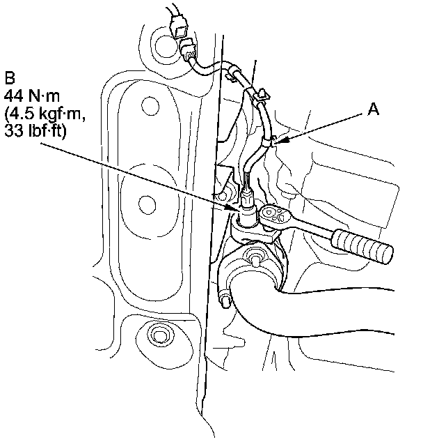 1. Disconnect the front secondary HO2S 4P connector (A), and remove the harness clamps (B).