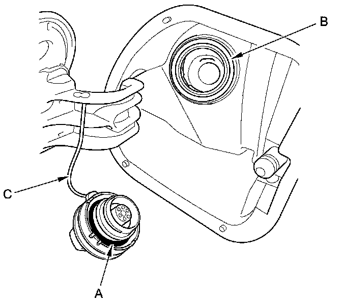 2. Check the fuel fill cap seal (A) and the fuel fill pipe mating surface (B). Verify that the fuel fill cap tether cord (C) is not caught under the cap.