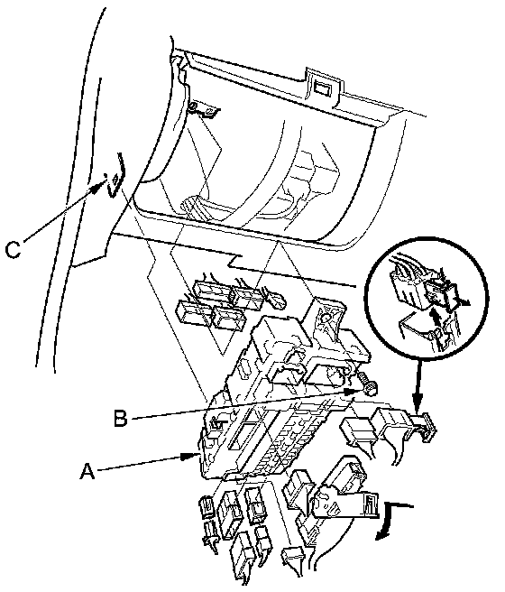 4. Remove the mounting bolt (B) and release the tab (C), and then pull the driver's under-dash fuse/relay box away from the body.