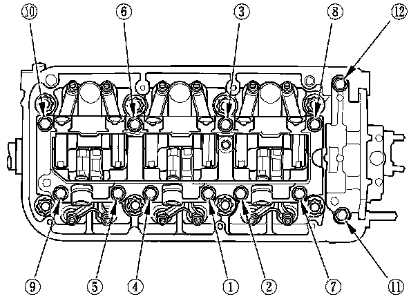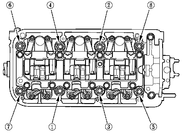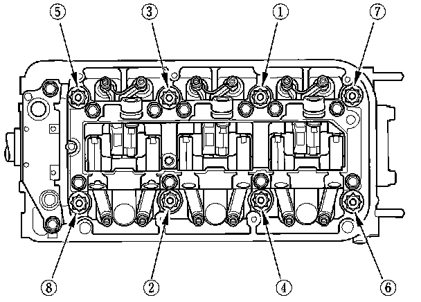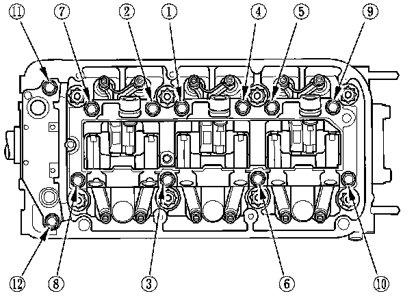 Tighten each bolt two turns at a time in the sequence shown to ensure that the rockers do not bind on the valves.
