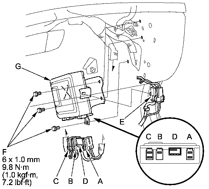 4. Remove the bolts (F) from the EPS control unit (G).