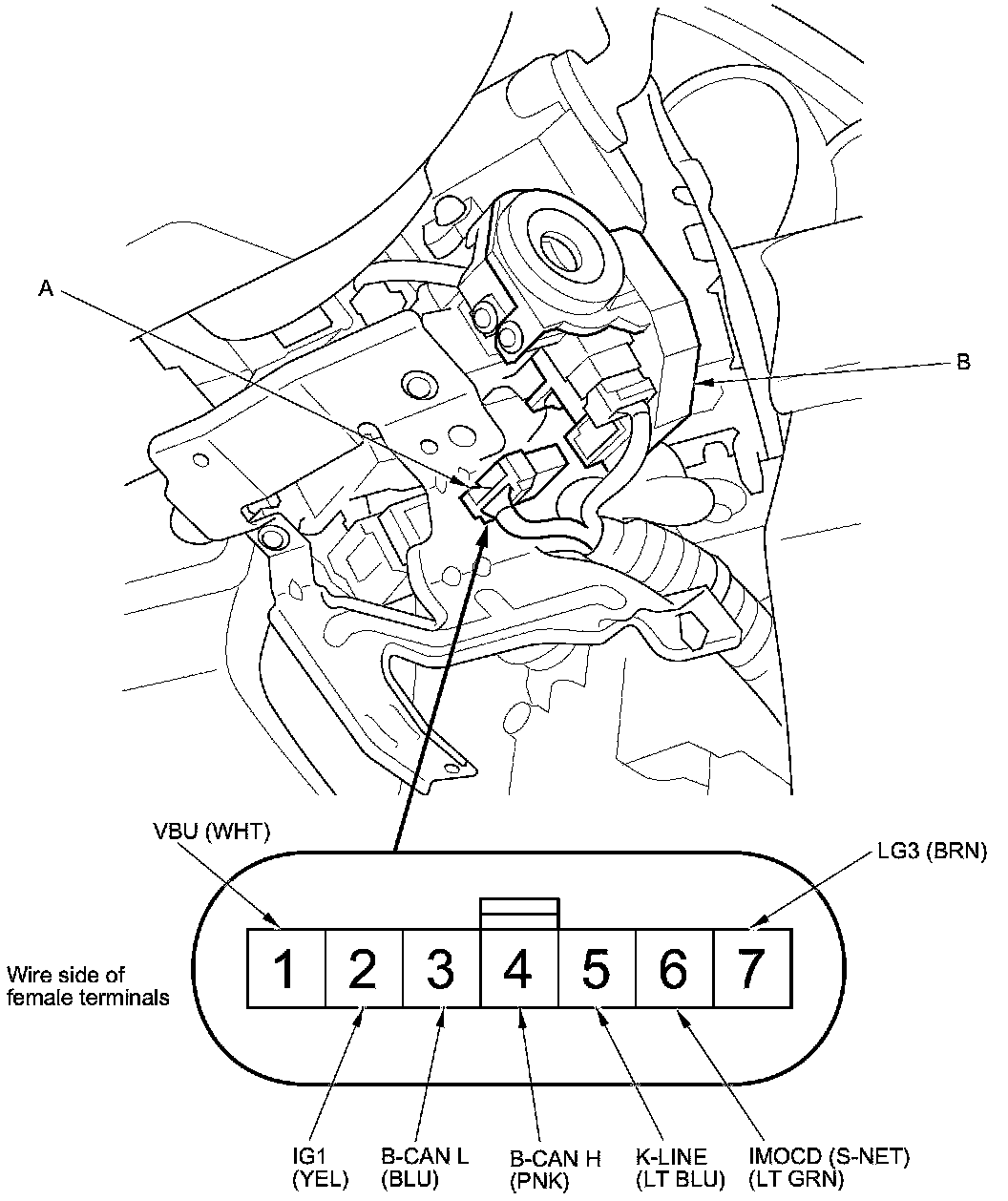 2. Disconnect the 7P connector (A) from the immobilizer-keyless control unit (B).