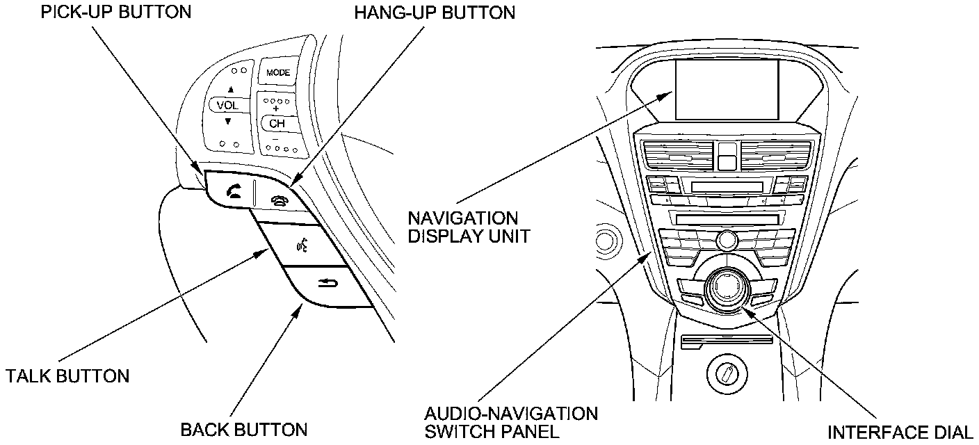 The navigation voice control switch is combined with the audio remote switch and the HFL switch. Navigation TALK/BACK commands are sent to the audio-navigation unit via the HandsFreeLink control unit.