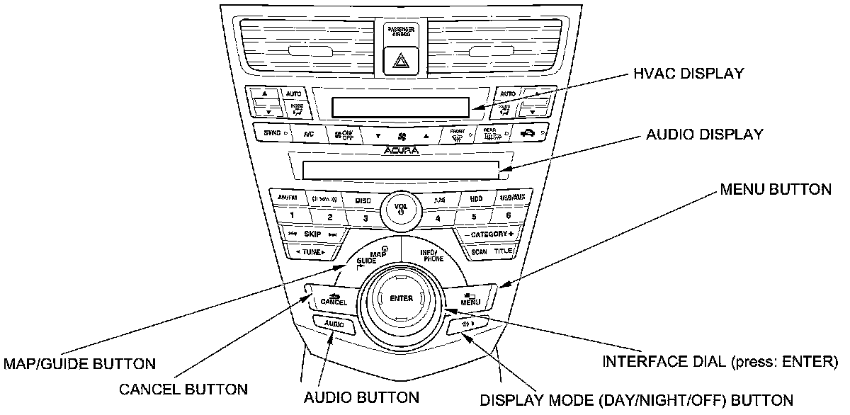 NOTE: The front speakers are muted whenever the navigation system is giving guidance commands, and all of the speakers when the voice control system is being used.