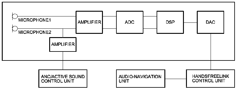 Receives voice commands and transmits them to the audio-navigation unit or HandsFreeLink control unit. The microphone unit consist of two microphones. One microphone is combined with the front ANC/active sound control microphone. The microphones detects the driver's voice and passenger's voice separately.