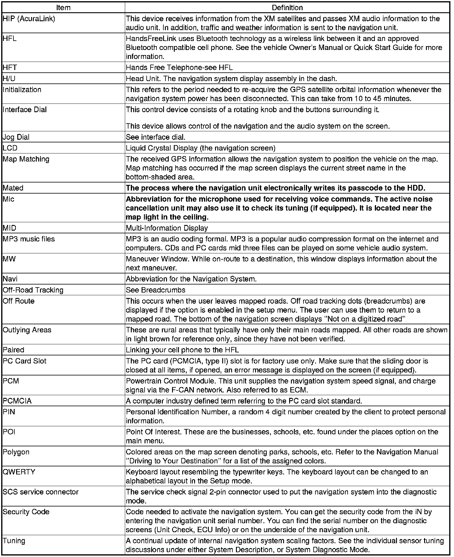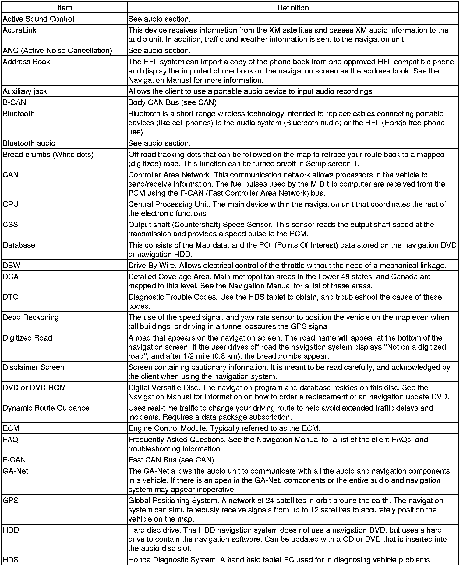 The audio-navigation unit calculates the vehicle position and guides you to the destination. The unit performs map matching correction, GPS correction, and distance tuning. It also controls the menu functions and the HDD, and interprets voice commands. With control of all these items, the audio-navigation unit makes the navigation picture signal, then it transmits the signal to the navigation display unit.