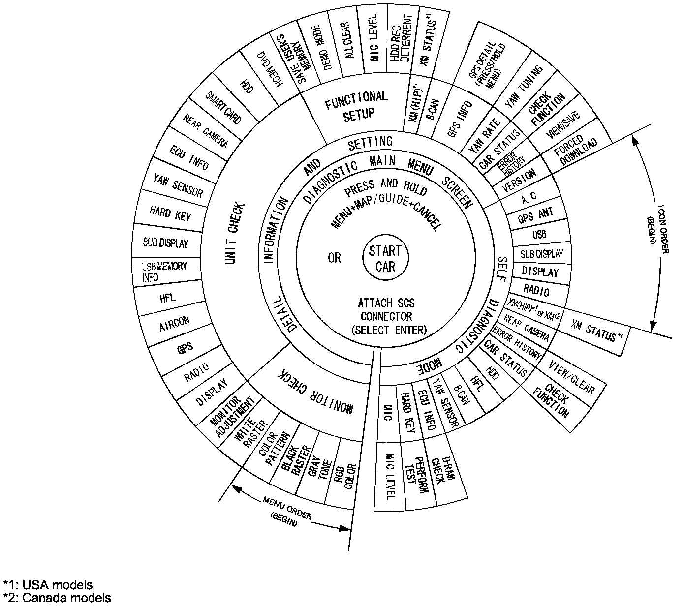 Access to the diagnostic features begins by starting the vehicle. This is necessary so the system can check the other systems connected by various busses. After starting the vehicle you can enter the diagnostic mode either by pressing and holding MENU, MAP/GUIDE, and CANCEL, or by connecting the 2-PIN SCS service connector.