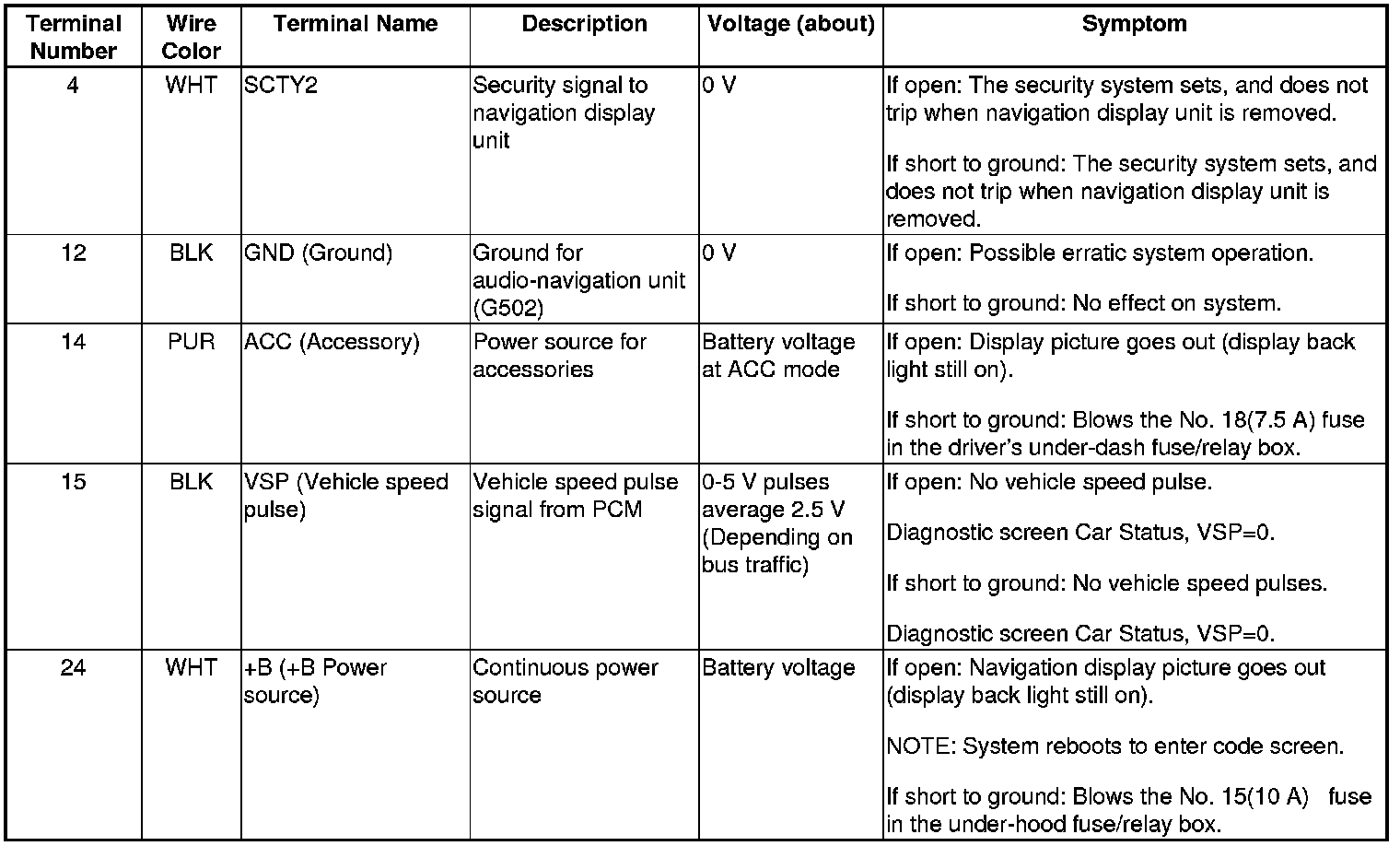 The audio-navigation unit calculates the vehicle position (the driving direction and the current position) by receiving the directional change signals from the yaw rate sensor and the travel distance signals from vehicle speed pulse (VSP) signal of the PCM.