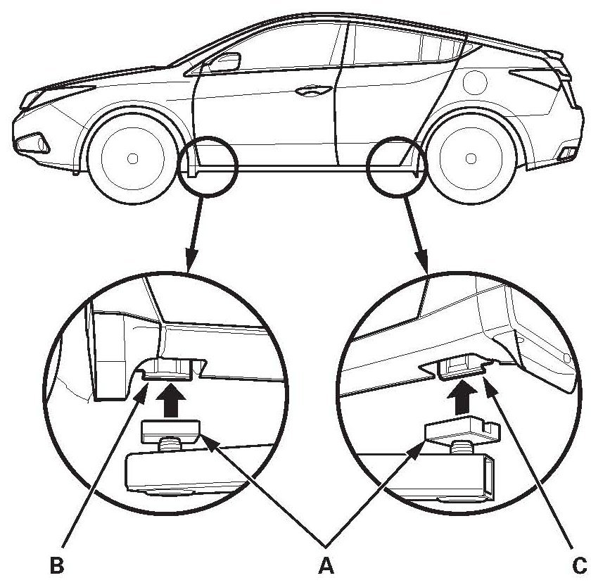1. Position the lift blocks (A) under the vehicle's front support points (B) and rear support points (C).