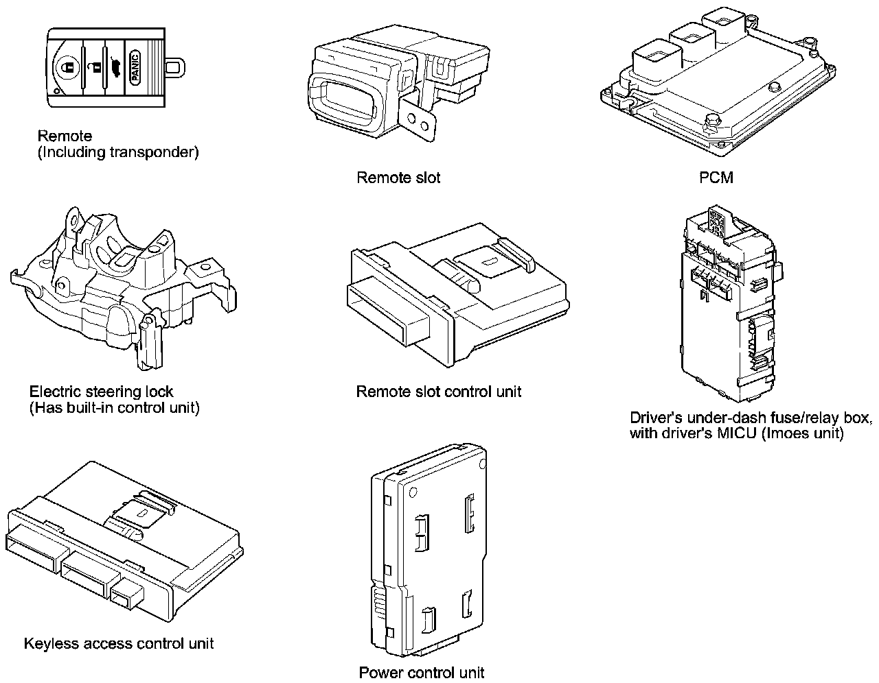 This system consists of a transponder built into the remote, a remote slot control unit, the driver's MICU (has built-in IMOES unit), an immobilizer indicator, and the PCM.