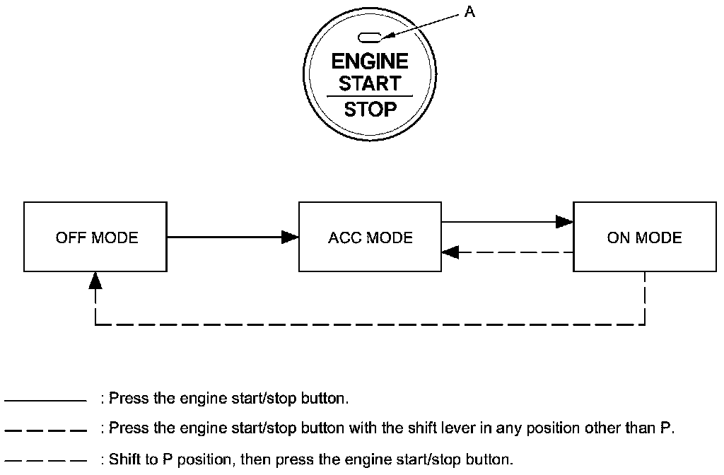 - OFF and START mode: Indicator (A) in the engine start/stop button is off.