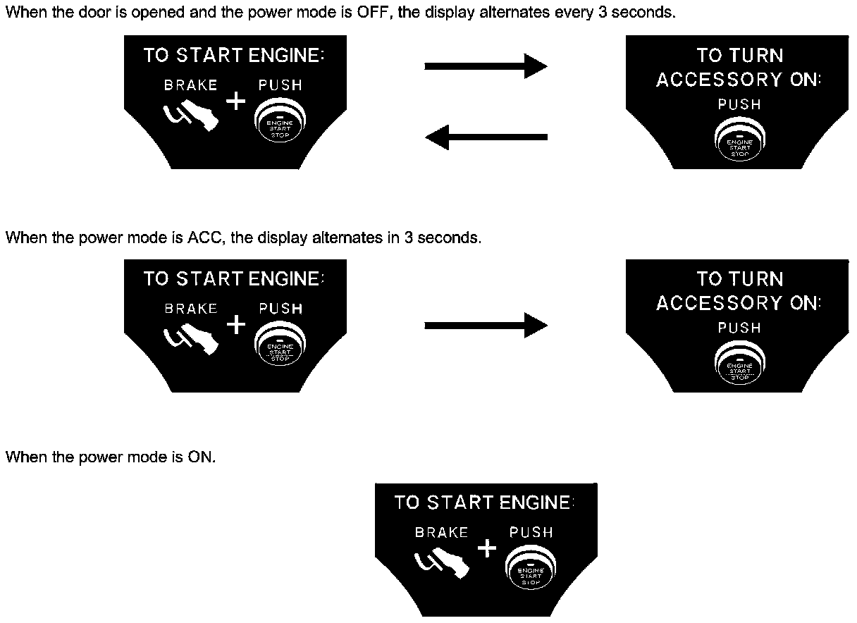 The keyless access system has four power modes: OFF, ACC, ON, and START. The power modes can be changed by pressing the engine start/stop button. The power mode changes to START mode any time the engine start/stop button is pressed while also pressing the brake pedal.