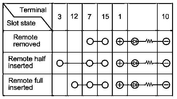 7. Connect the positive battery terminal to remote slot connector terminal No. 16, and the negative battery terminal to terminal No. 8. Check that the remote cannot be removed from the remote slot. Connect the positive battery terminal to remote slot connector terminal No. 8, and the negative battery terminal to terminal No. 16. Check that the remote can be removed from the remote slot.