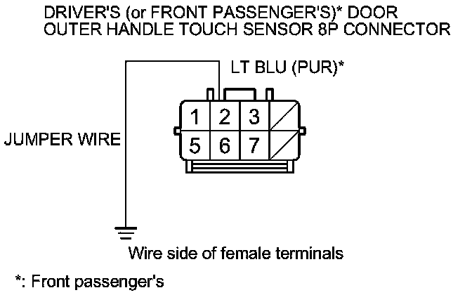 12. Connect the driver's (or front passenger's) door outer handle touch sensor 8P connector terminal No. 2 to body ground with a jumper wire.