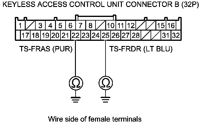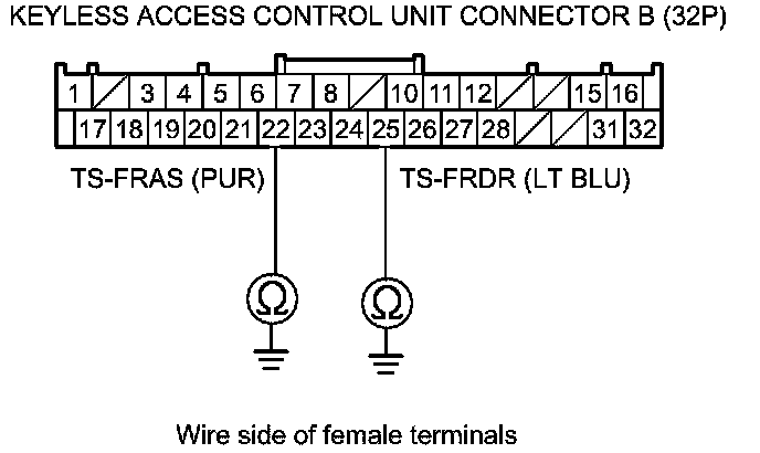 15. Check for continuity between keyless access control unit connector B (32P) terminal No. 22 and body ground (for front passenger's door touch sensor), or between keyless access control unit connector B (32P) terminal No. 25 and body ground (for driver's door touch sensor) individually.