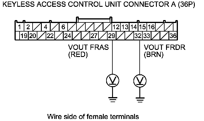 16. Measure the voltage between keyless access control unit connector A (36P) terminal No. 32 and body ground (for driver's door touch sensor), or between keyless access control unit connector A (36P) terminal No. 29 and body ground (for front passenger's door touch sensor) individually.