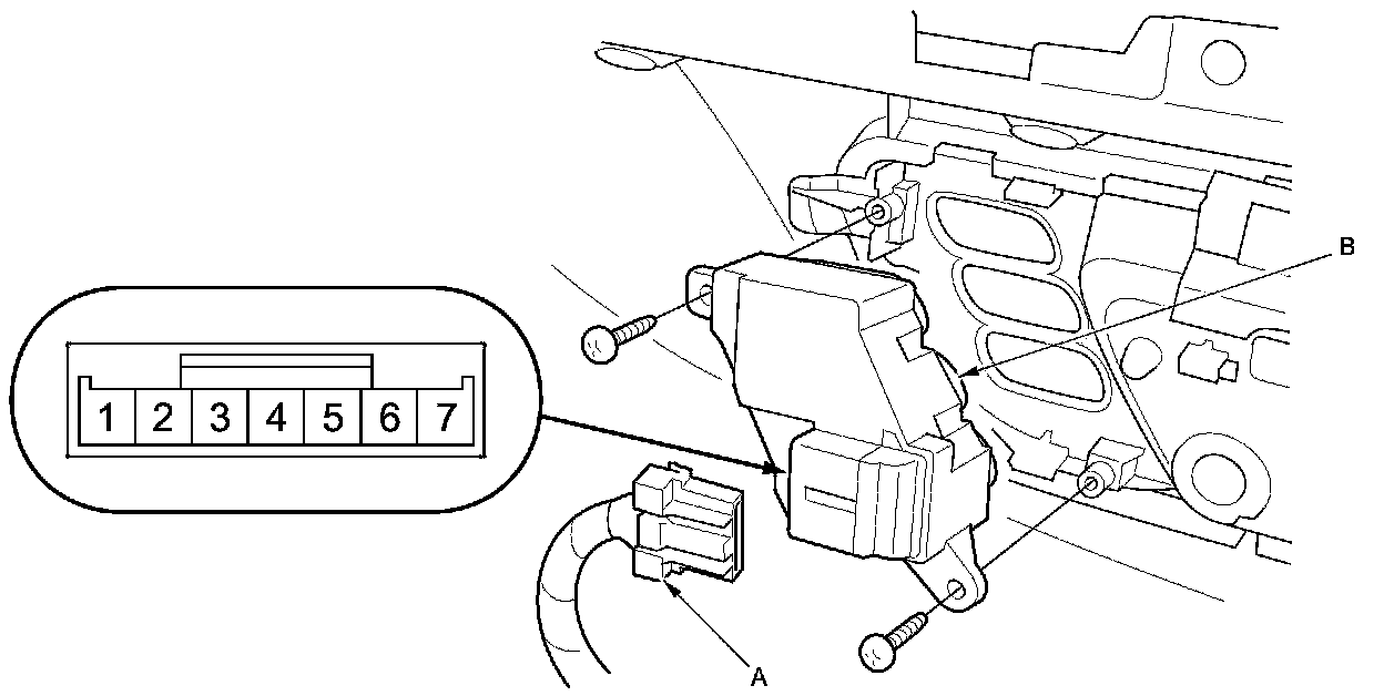 2. Disconnect the 7P connector (A) from the driver's position memory switch (B).