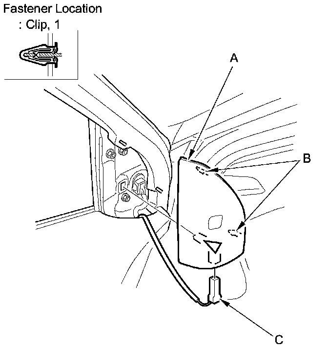 1. With your hand, carefully pull out the top edge of the door mirror cover to release the hooks (B) and detach the clip.