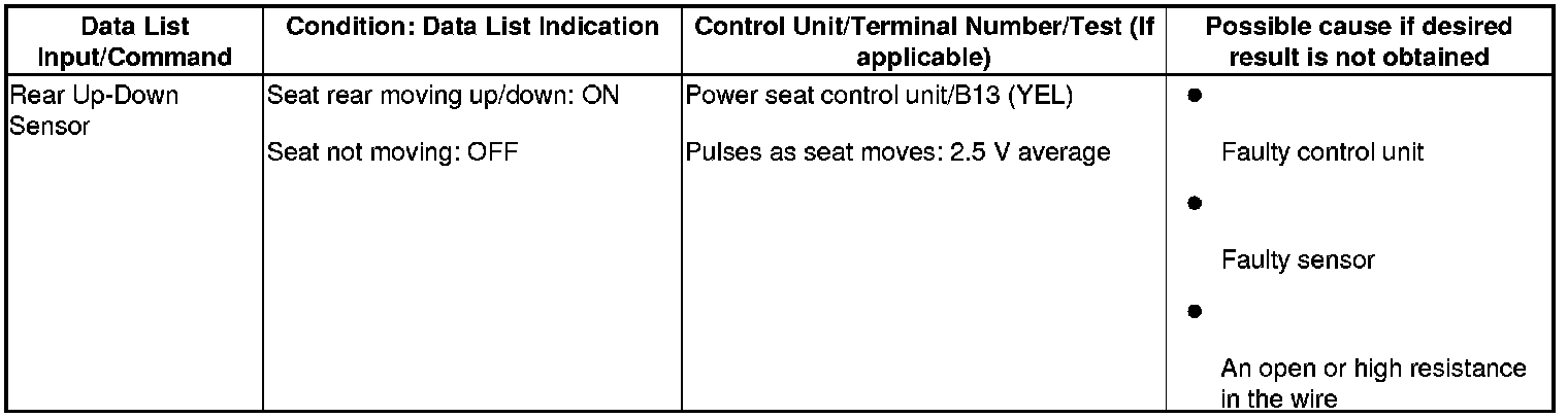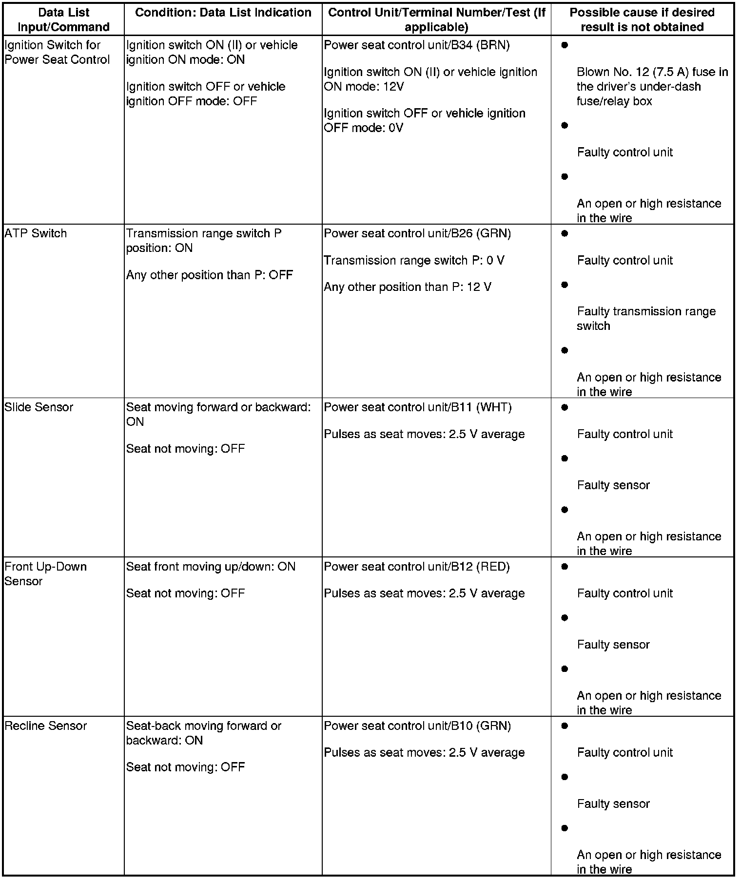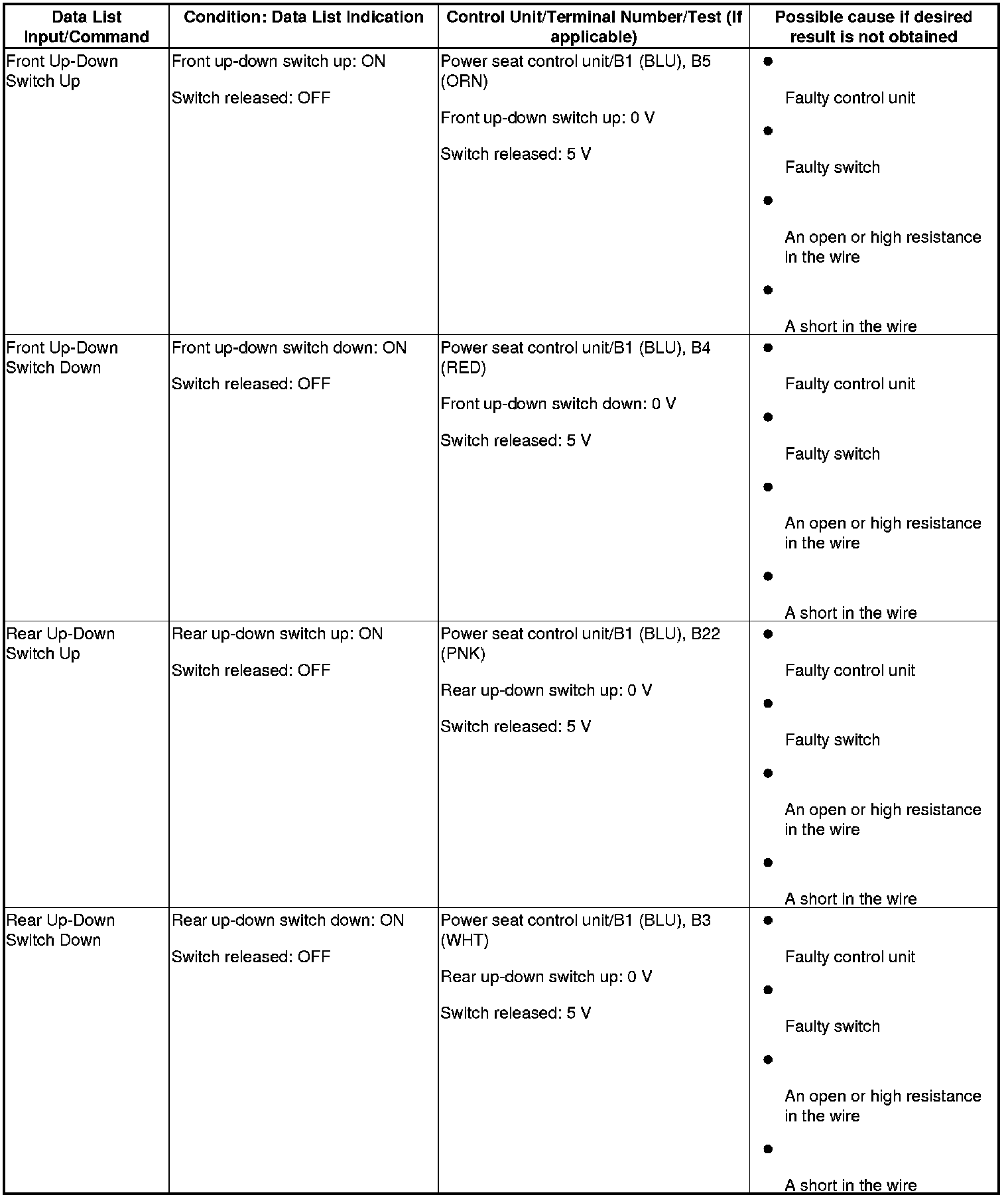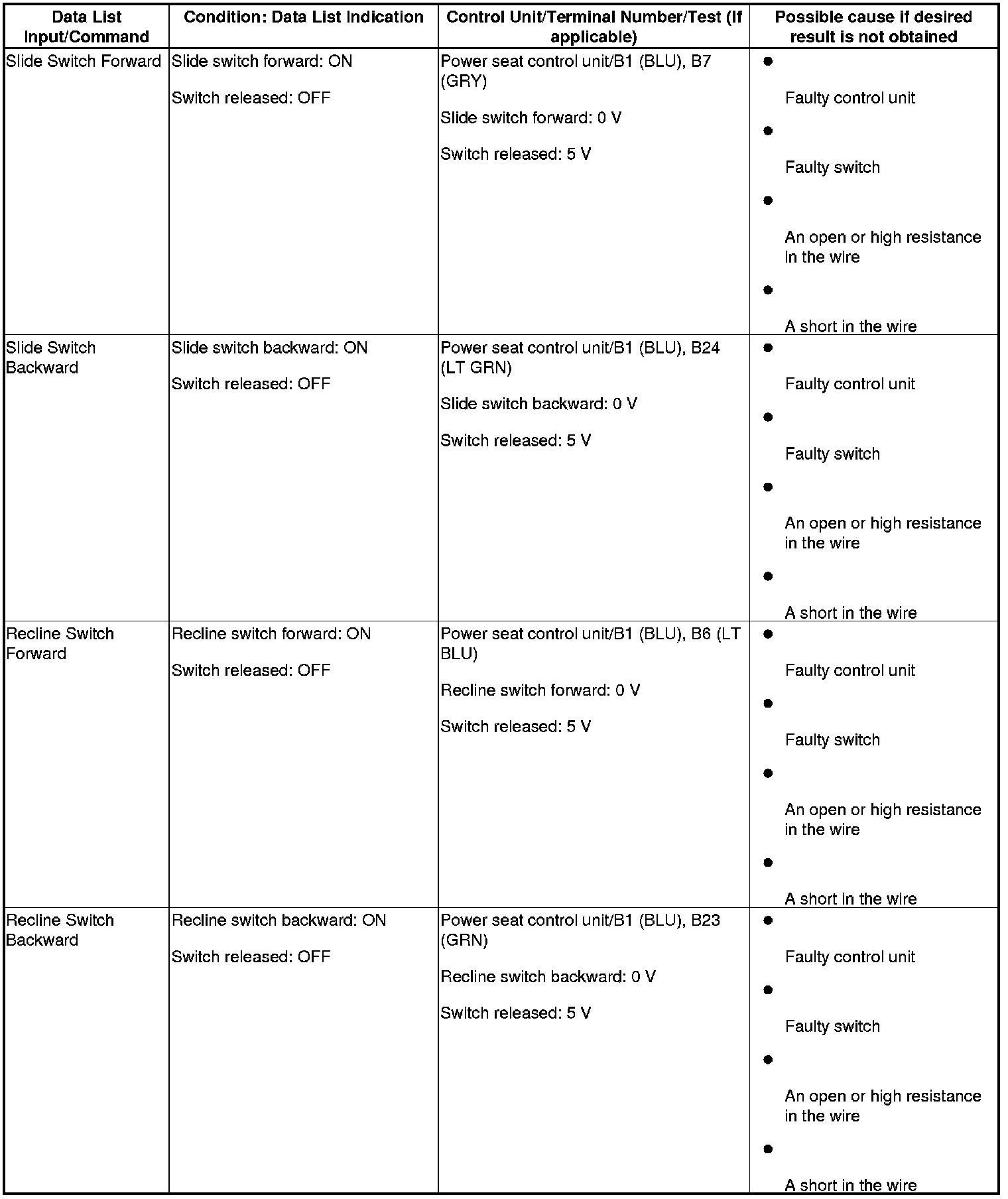 - If the data list indication is not correct, do the appropriate test at the control unit and terminal indicated in the table.