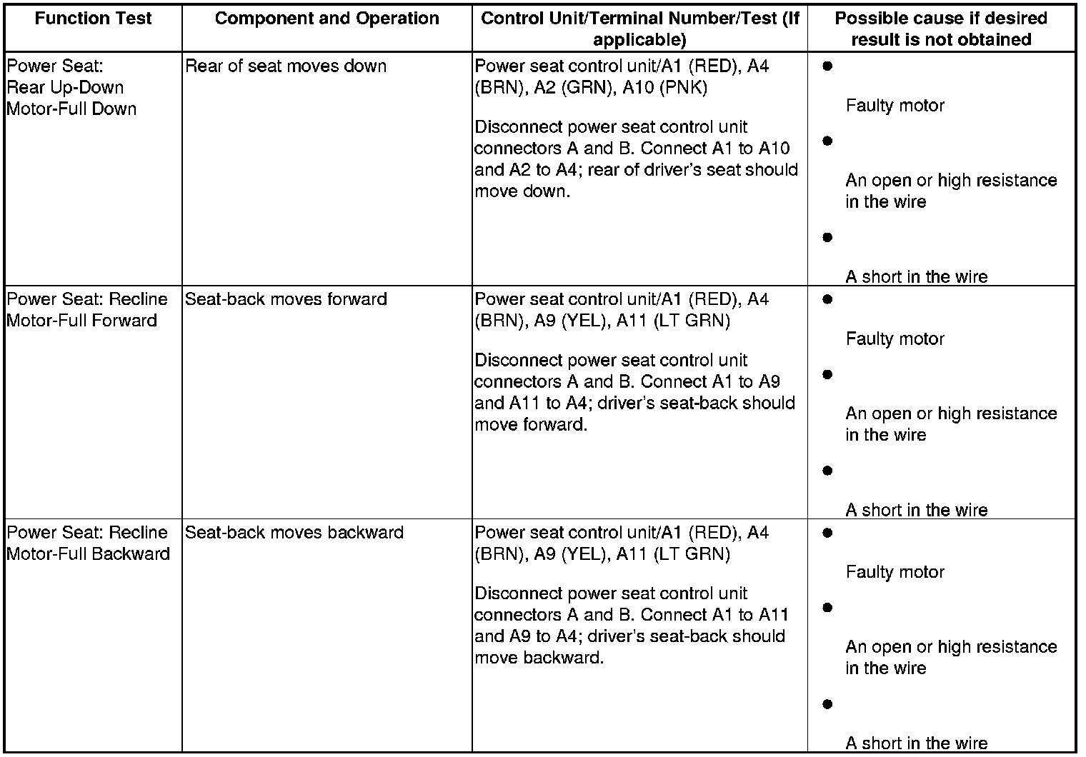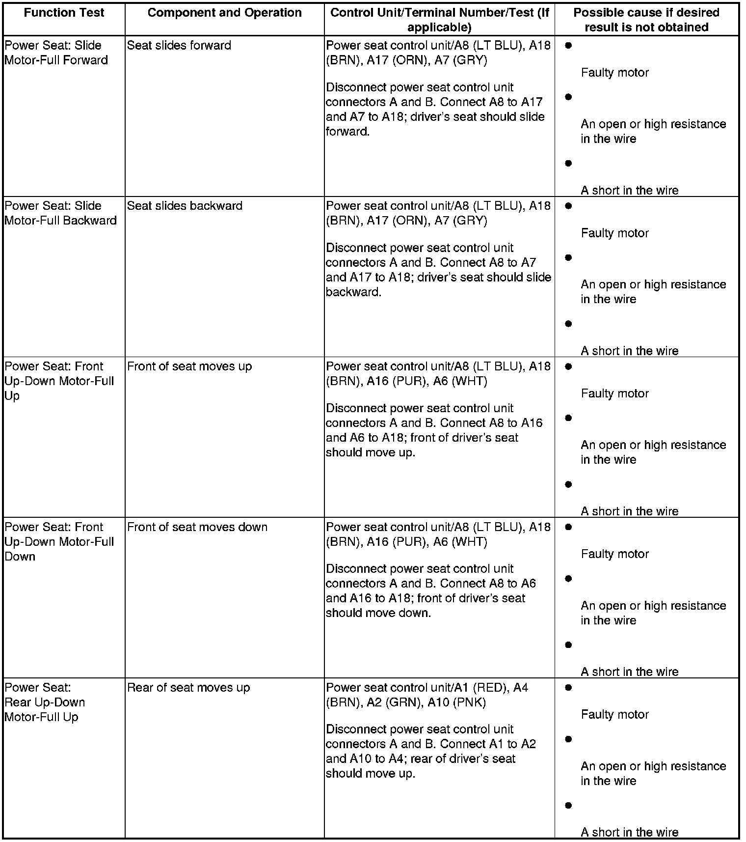 - If the function does not occur, do the appropriate test at the control unit and terminal indicated in the table.