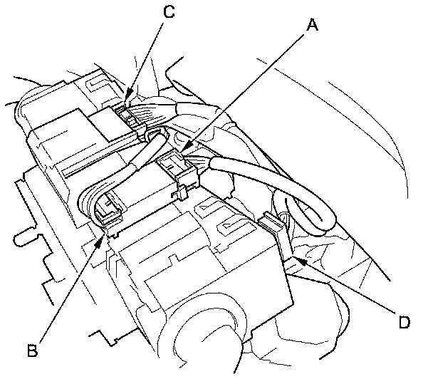 4. Disconnect the dashboard wire harness 4P connector (A) from the cable reel 4P connector (B), then disconnect the dashboard wire harness 20P connector (C) and the wiper/washer switch 8P connector (D).