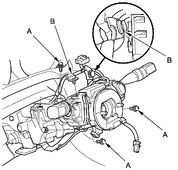 5. Remove the combination switch assembly/cable reel mounting screws (A).