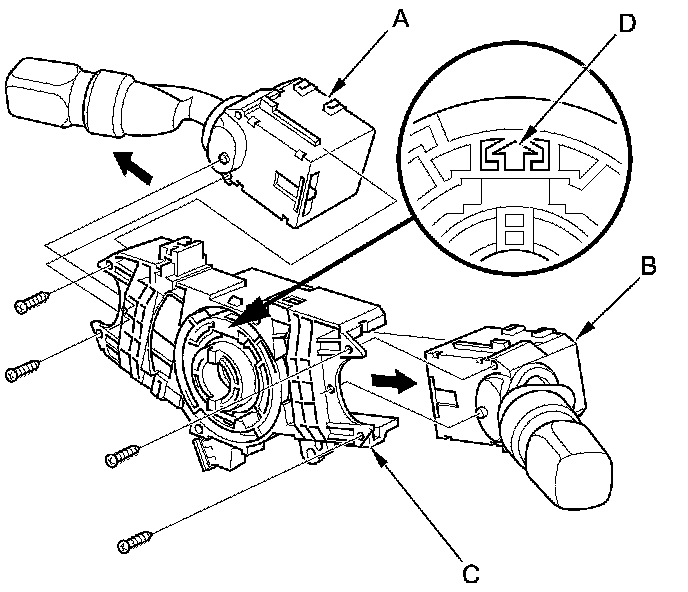 NOTE: When installing the cable reel, set the turn signal canceling sleeve position so that the arrow points (D) straight up.
