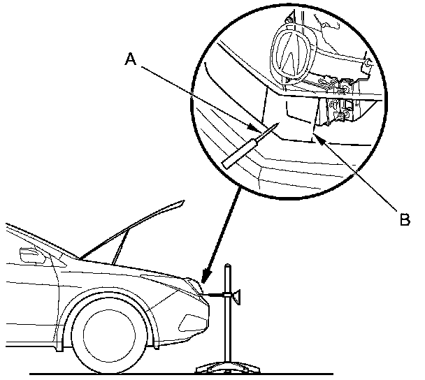 5. Adjust the tip of the height rod (A) on the target to the center of the front grille radar cover (B).