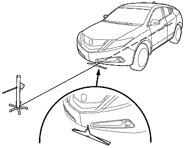 9. With the target and the height rod aligned with the cord, move the target out in front of the vehicle until the cord is fully extended 16.4 ft (5 m) from the front of the front bumper. Position the cord at the centerline of the centering stand.