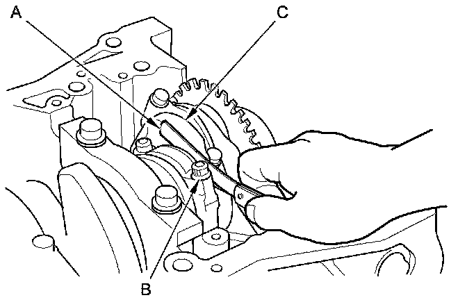3. Measure the connecting rod end play with a feeler gauge (A) between the connecting rod (B) and the crankshaft (C).