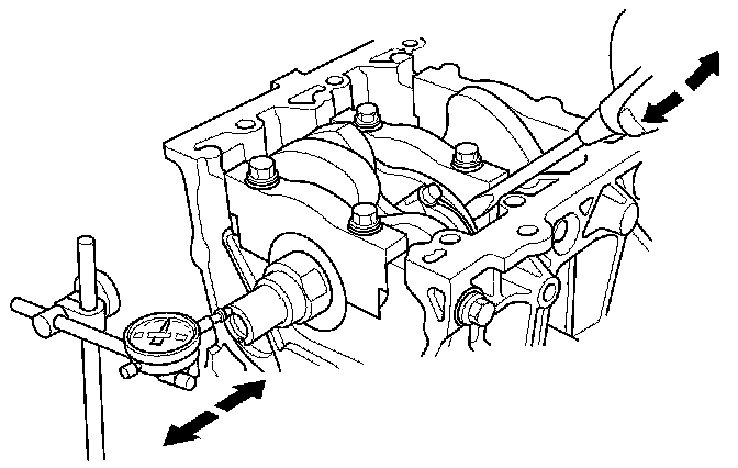 5. Push the crankshaft firmly away from the dial indicator by prying, and zero the dial against the end of the crankshaft. Then pull the crankshaft firmly back toward the indicator by prying; the dial reading should not exceed the service limit.