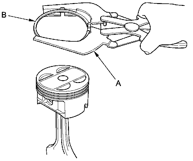 2. Using a ring expander (A), remove the old piston rings (B).