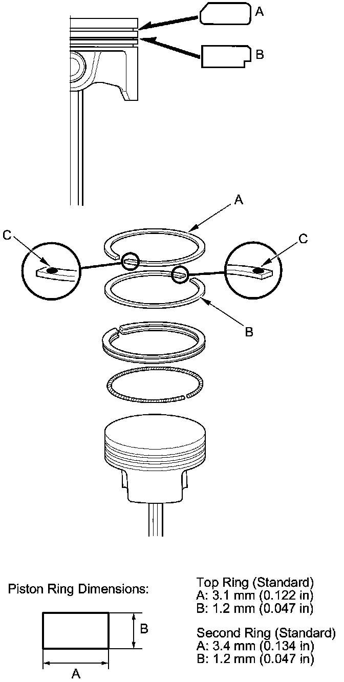 6. Install the rings as shown. The top ring (A) has a 1E mark and the second ring (B) has a 2E mark. The manufacturing marks (C) must be facing upward.
