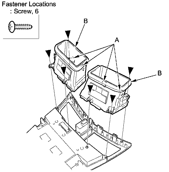 2. From back of the switch panel, remove the screws, then release the hooks (A) and remove the center vents (B).