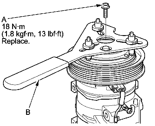 1. Remove the center bolt (A) while holding the pressure plate with the A/C clutch holder (B).