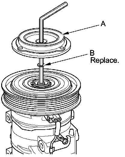 3. If you are replacing the field coil, remove the snap ring (A) with snap ring pliers, then remove the pulley (B). Be careful not to damage the pulley or the A/C compressor.