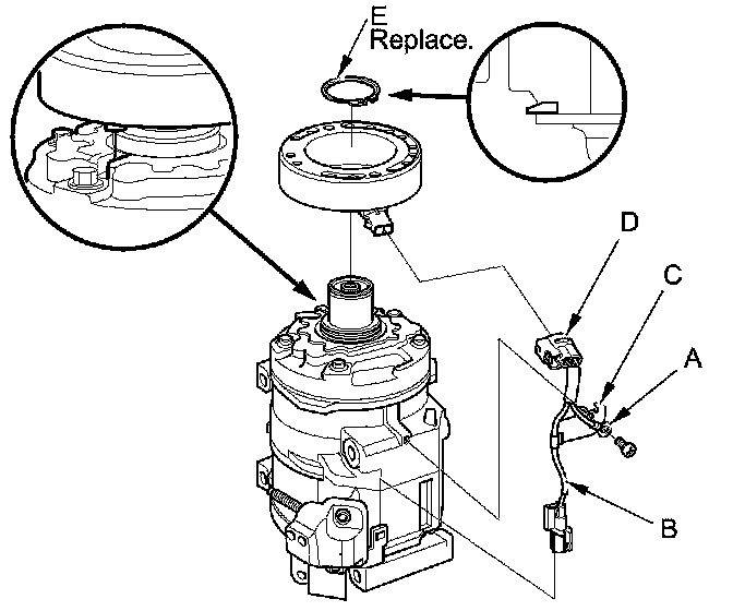 - Install the field coil with the wire side facing down, and align the boss on the field coil with the hole in the A/C compressor.