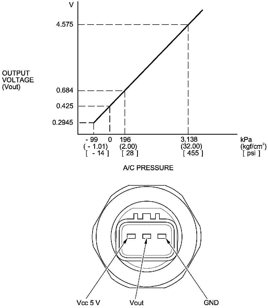 NOTE: When the refrigerant is below 196 kPa (2.00 kgf/cm2, 28.4 psi) or above 3,138 kPa (32.00 kgf/cm2, 455.1 psi), the PCM turns the A/C compressor clutch relay off to protect the A/C compressor. When the refrigerant pressure is above 1,470 kPa (14.99 kgf/cm2, 213.2 psi), the PCM switches the radiator and A/C condenser fans to high speed.