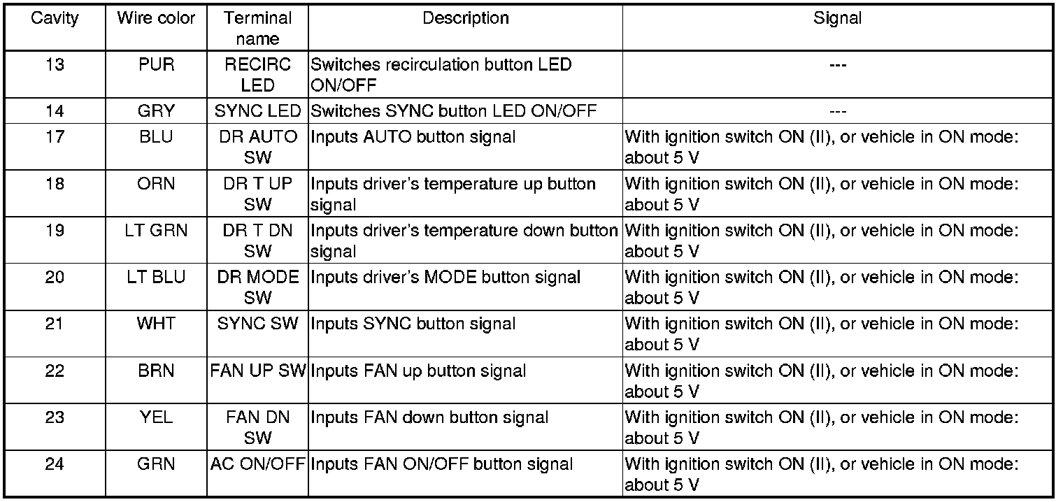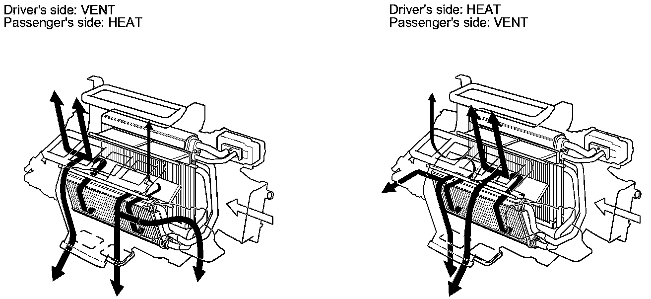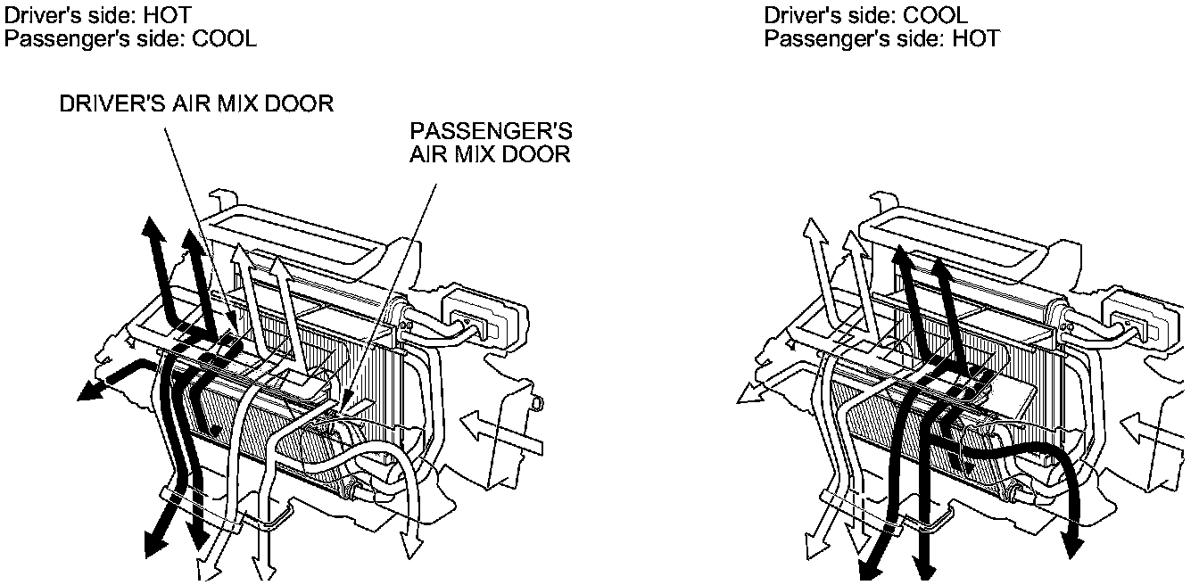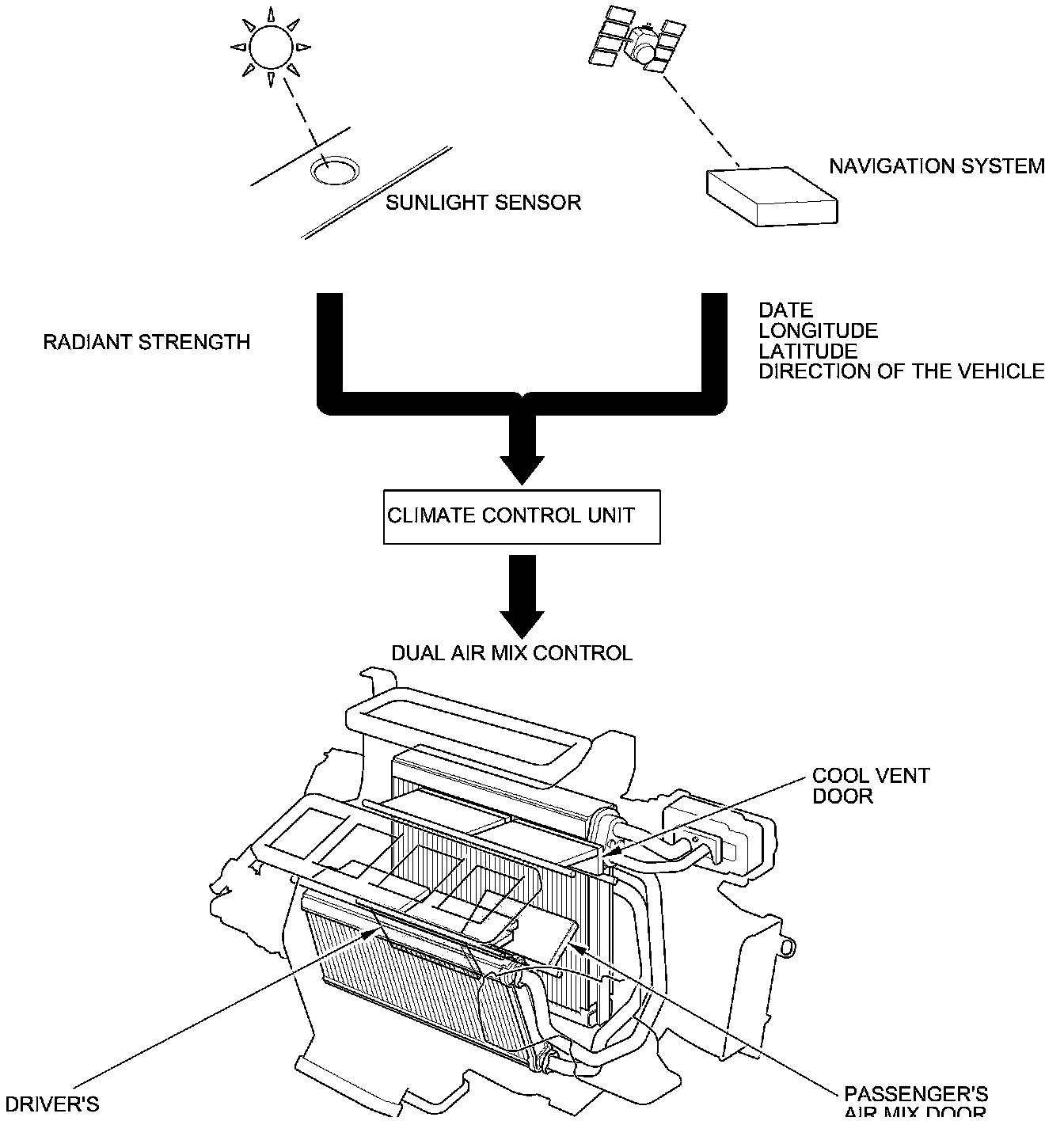 This system automatically controls the temperature and the air direction to the driver and passenger's side depending on the angle of the sun and the direction of the vehicle. It calculates information such as date, time, longitude, and latitude from the navigation system, as well as the radiant strength of the sun from the sunlight sensor, to determine the appropriate mode position and temperature to be directed to each side.