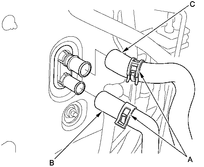 5. From under the hood, slide the hose clamps (A) back. Disconnect the inlet heater hose (B) and the outlet heater hose (C) from the heater unit. Note the layout of the hoses.